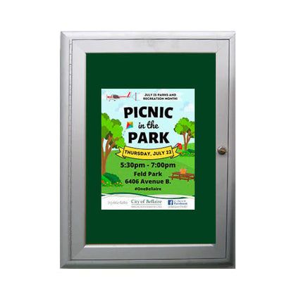 Choose from 4 standard metal display case finishes: Satin Silver, Black, Dark Bronze, and Satin Gold. You can also create a colorful bulletin board with any one of the 5 optional vinyl covered cork board colors.