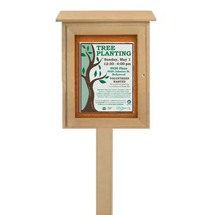 • Floor Stands. A freestanding cork board is an excellent way to grab the attention of people passing by. Countless uses of one, two, or three-door standing cork board display cases exist. Restaurants can use multiple panels to attach lunch and dinner specials. Schools can feature different displays for different classes—the choice is yours. Even enclosed, extra-large outdoor bulletin boards are available. Our weatherproof freestanding cork boards let you take your notices outdoors to a broader audience. Each weather-resistant feature ensures your interior materials are shielded from the outdoor elements, and your display continues to look as good as new. For indoor applications, browse our standing bulletin boards on a single pedestal post. These floor stands are slim, making them great for high-traffic indoor locations, like cafes and restaurants. A 24x36 free-standing cork board is an excellent advertising tool, as many promotional graphics are printed on material of this size. The 24 x 26 poster size is a popular print sheet for many commercial signage applications.