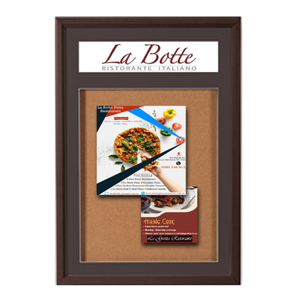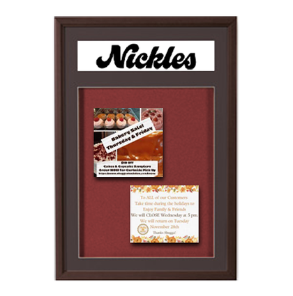 Send Your Bulletin Board with Header Text Message when Ordering. A personalized message header above the framed bulletin board is yours to create. Please send us your text header message. Examples include short, readable text that can be seen from a distance, such as your company or organization name, and also for school, church, or other messages like; COMMUNITY, JOB POSTINGS, INFORMATION, MENU, and SCHEDULE. Fewer words are stronger for visible impact. The header is easily changeable. We'll print the header text message free in all uppercase black Helvetica font up to 3 inches in height. As an option, if you want something more custom, such as a BW or Color Logo, a different font style, or a graphic image for your header. Or you can leave the header blank and add it later yourself or have your local sign shop print it.