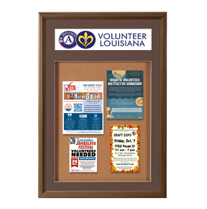 SwingFrame standard wood frame enclosed bulletin boards, with natural cork pin board, has a 2" interior usable space to post your materials onto. The outer frame depth is 3 5/8" and is within ADA regulations. When LED lights are added to the interior case, the Wood Swingframe Designer Bulletin Board with Message Header has an overall wall depth of only 4" inches. LED lights last a very long, with an average life of 50,000 hours. And energy-efficient—saving your business money while helping the environment! Call for more info.