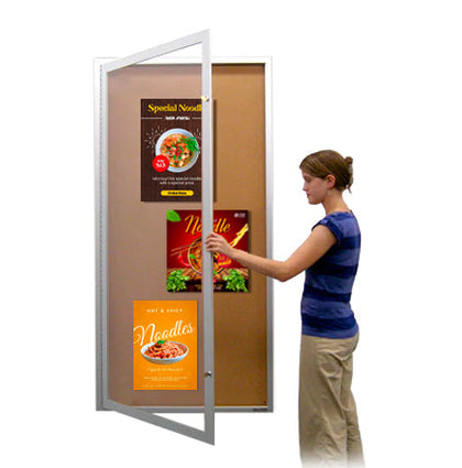 The extra large 24x84 single door frame has a solid continuous hinge and is secured with front door cam locks. The break-resistant Lexan polycarbonate window provides a clear view of your announcements.