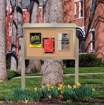 This Outdoor Enclosed Bulletin Board gets noticed easily. That's because the 60"x24" Double Door Exterior Message Board comes with two posts. The free standing display case and posts feature faux wood construction that's Maintenance-Free and Eco-Friendly.