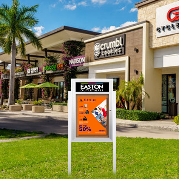 The 8 ft aluminum posts of this outdoor message center mounts 3 ft in-ground. Once secured, the SwingCase enclosed weatherproof bulletin board cabinet is built to withstand the outside elements and remain where you intended.