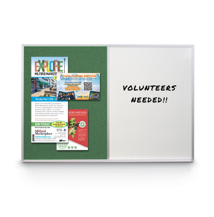This multi-purpose magnetic dry erase cork bulletin combo board has an attractive 1/2" wide satin aluminum trim border to frame the board. This open face combo board is ideal for writing notes, messages, and more while posting bulletins such as; fliers, posters, photos, restaurant menus, or any other posting, message or advertisement you wish to display.